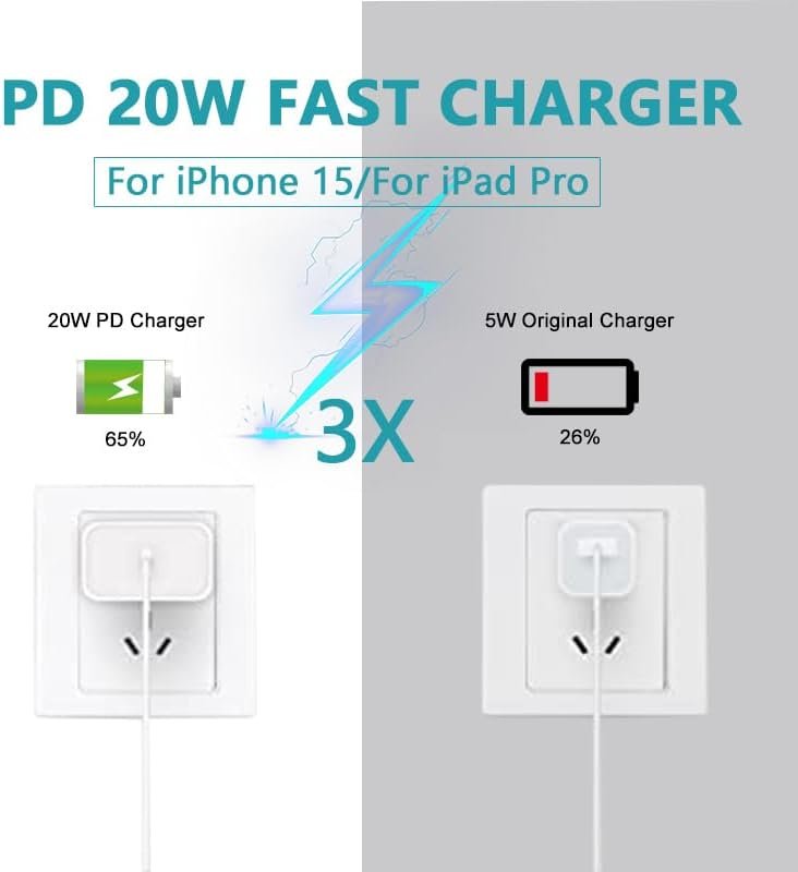 - Compatible with iPhone 15 Fast Charger USB C Wall charger provides 20W power output and charges your phone up to 50% more in just 30 minutes, which is 3 times faster than the original charger and saves you more than 1 hour.